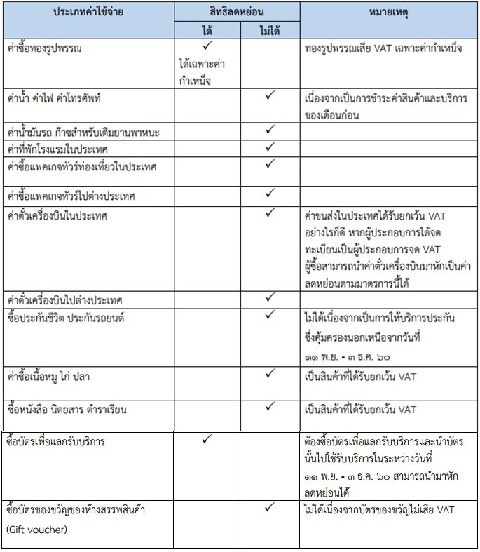 สามารถนำค่าสินค้าหรือบริการมาหักลดหย่อนภาษีได้ หากซื้อจากร้านค้าที่สามารถออกใบกำกับภาษีได้ โดยต้องซื้อระหว่างวันที่ 11 พฤศจิกายน - 3 ธันวาคม 2560