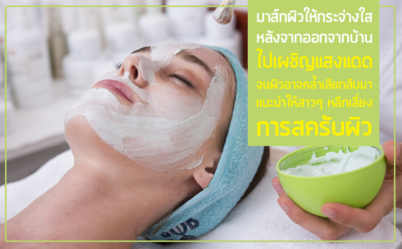 •มาส์กผิวให้กระจ่างใส หลังจากออกจากบ้านไปเผชิญแสงแดดจนผิวอาจคล้ำเสียกลับมาแนะนำให้สาวๆ หลีกเลี่ยงการสครับผิวก่อนเพราะอาจจะทำให้ผิวยิ่งระคายเคืองหนัก